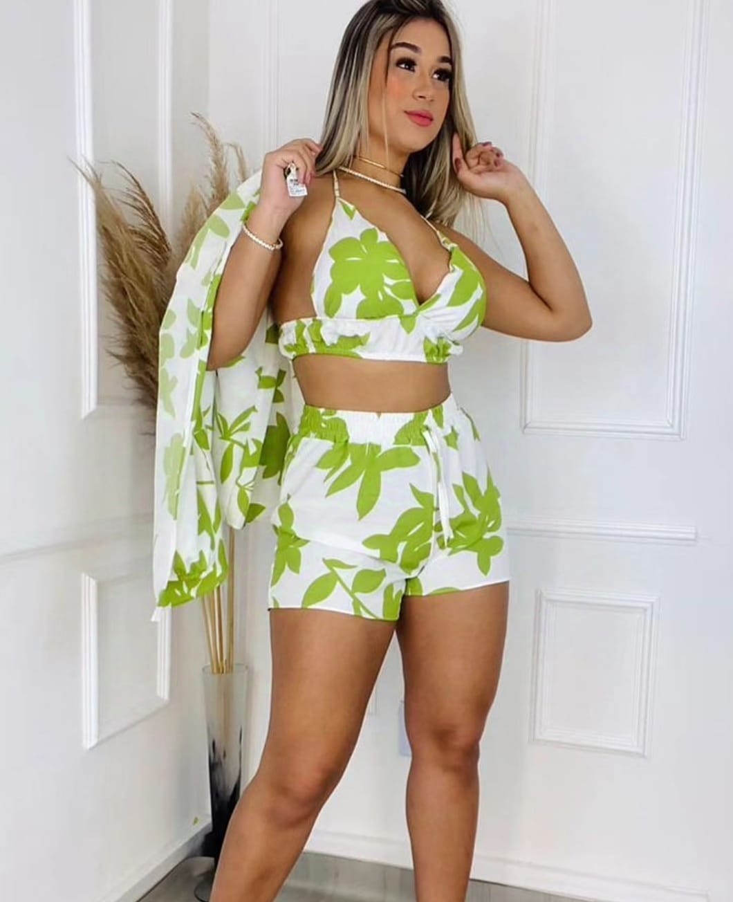 O conjunto feminino de kimono de manga longa, top cropped e shorts é uma escolha prática e estilosa para os dias quentes de verão. Feito em tecido leve de poliéster, o kimono proporciona conforto e frescor, sendo ideal para sobreposição, adicionando um toque sofisticado ao look. O top cropped traz um estilo moderno e descontraído, perfeito para compor produções despojadas, enquanto o shorts completa o conjunto, garantindo conforto e liberdade de movimento. Além de ser versátil, a combinação pode ser usada em diversas ocasiões, seja em passeios ao ar livre, eventos casuais ou até mesmo na praia.