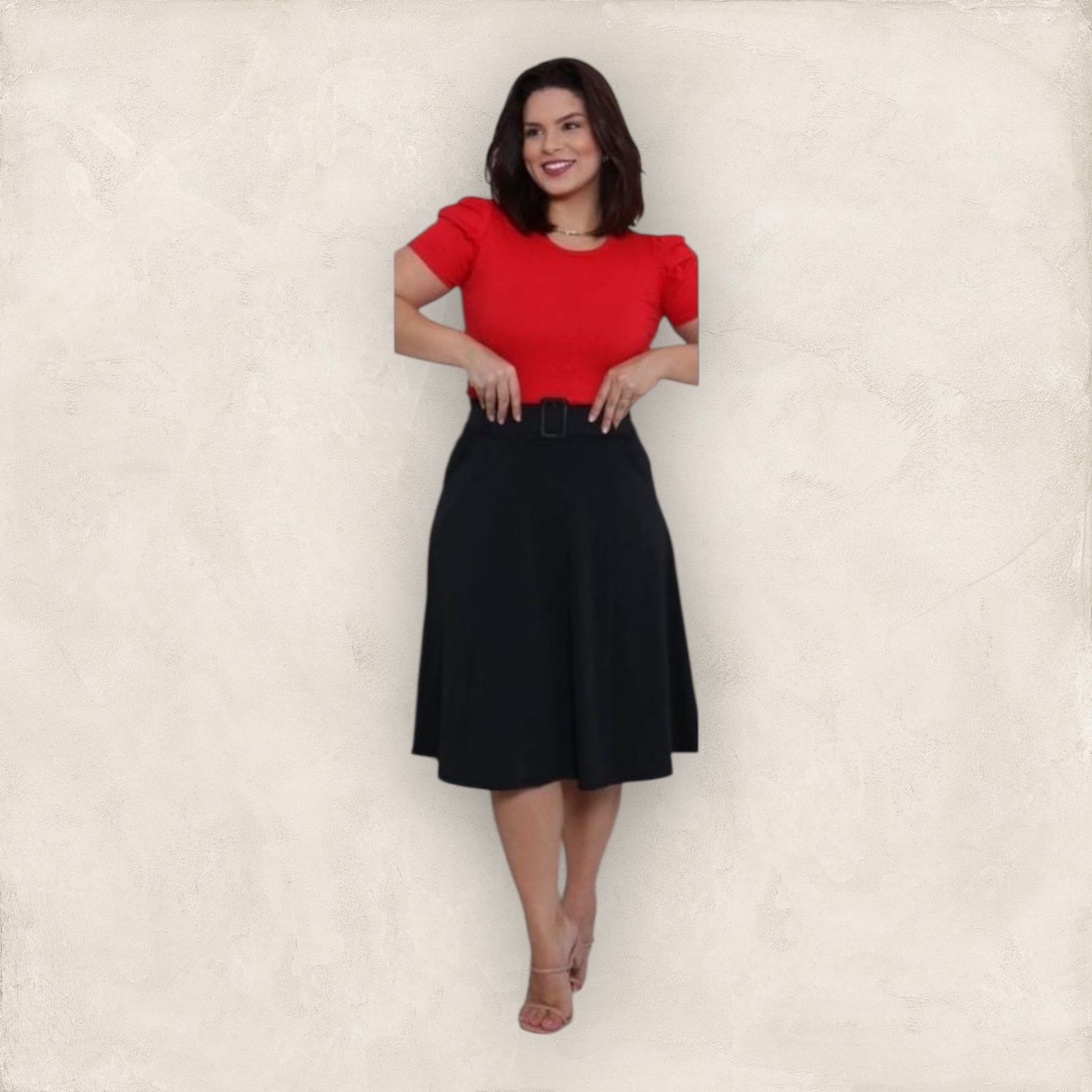 A Saia Godê Lisa com Cinto é aquela peça curinga que transforma qualquer look com feminilidade, charme e muito estilo. Com modelagem godê, ela proporciona um caimento fluido e soltinho, valorizando a silhueta com leveza e movimento.