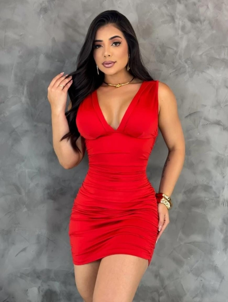 Vestido justo e curto com decote em V profundo, perfeito para valorizar a silhueta com estilo moderno e sensualidade.